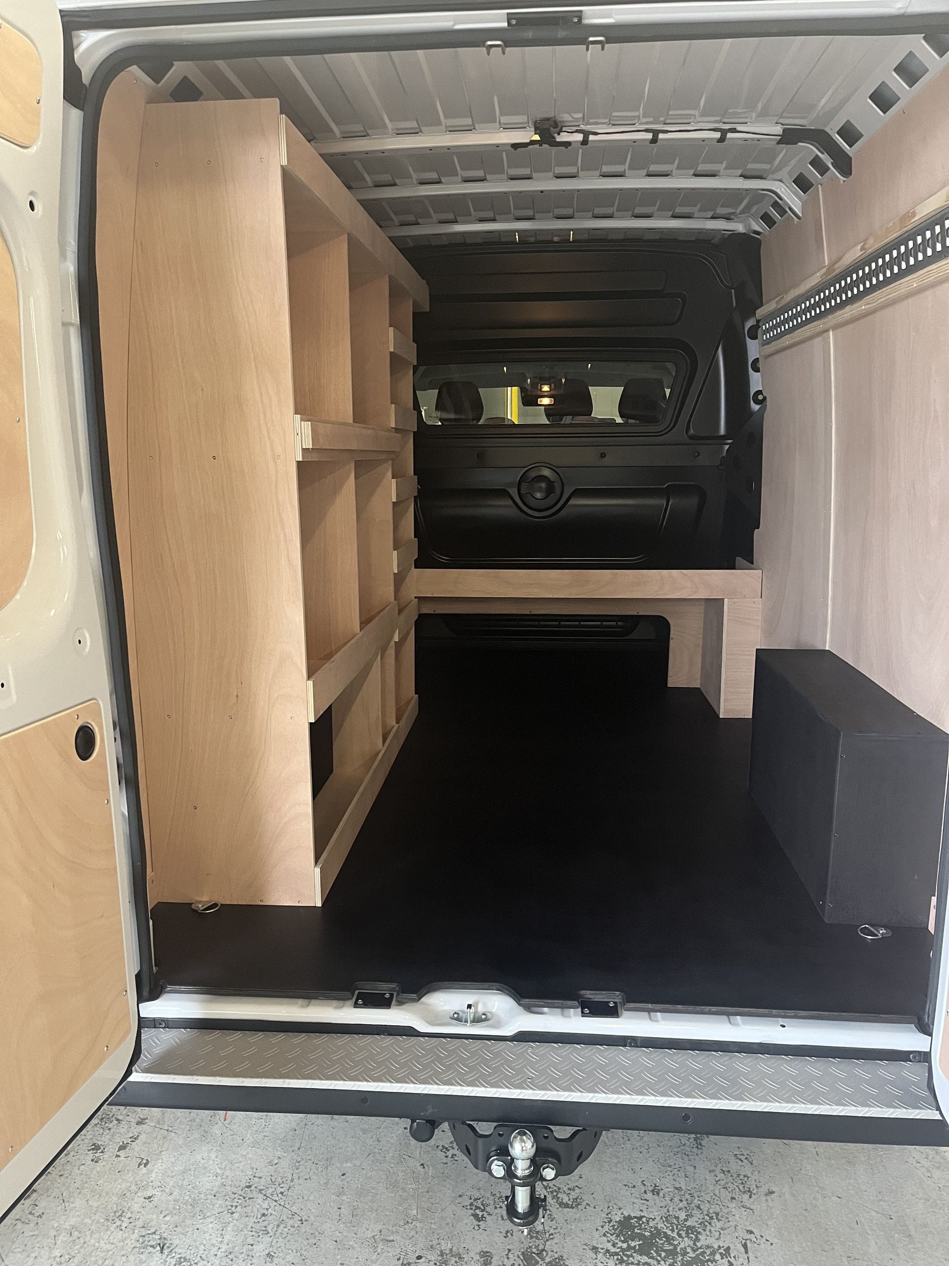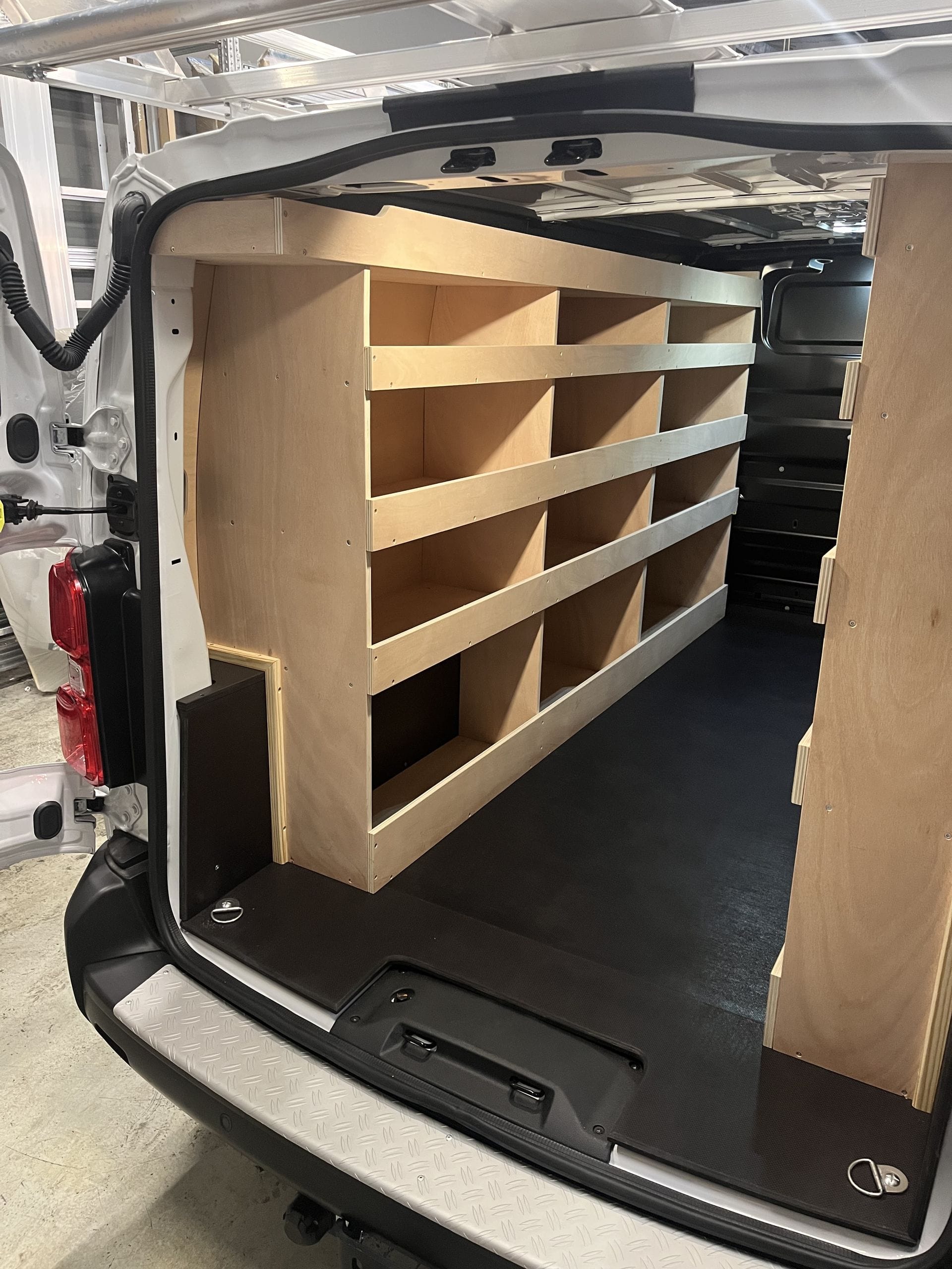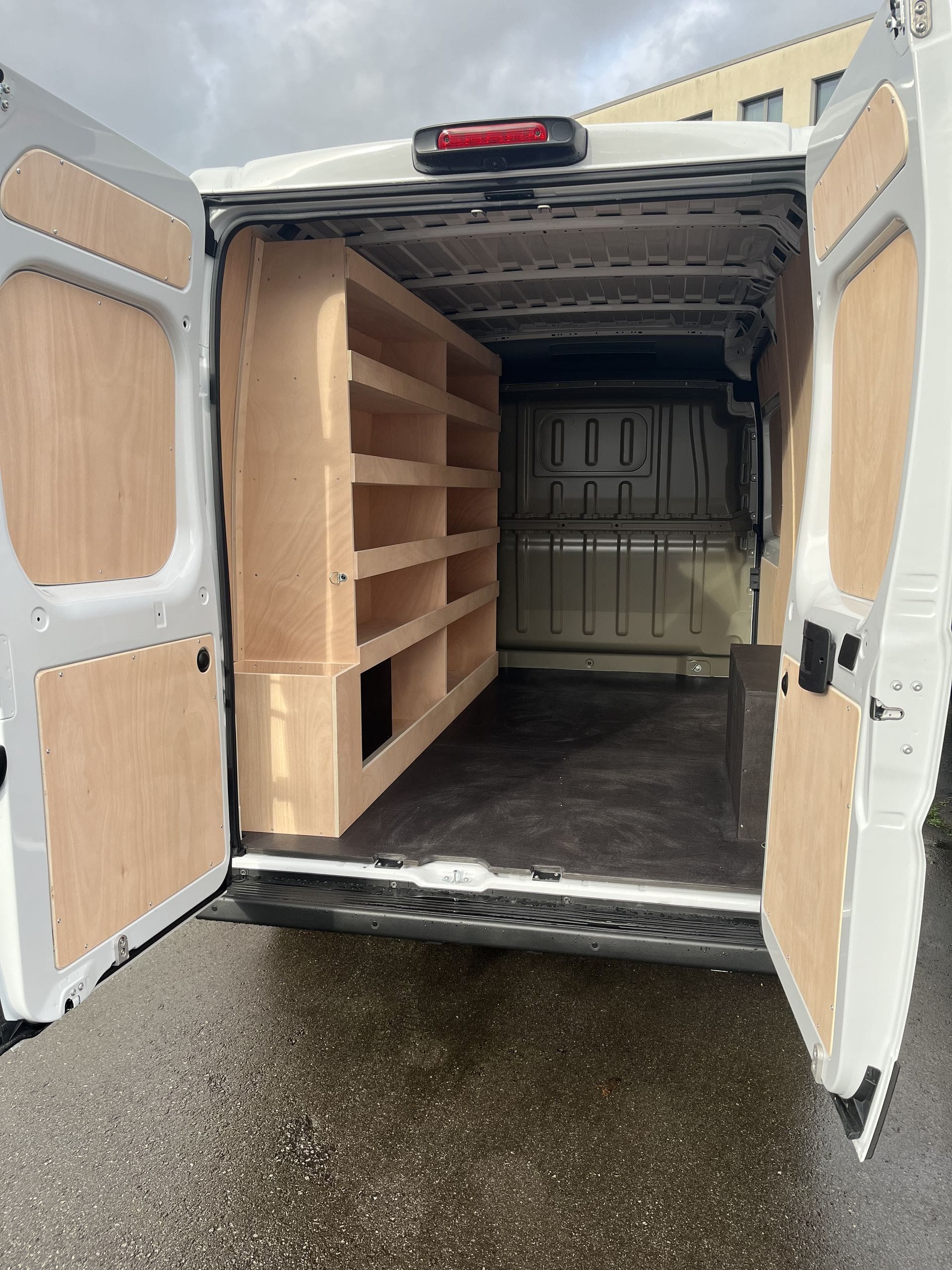 Aménagement en bois dans un fourgon utilitaire.